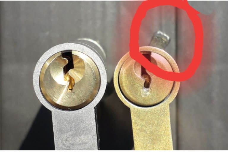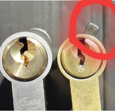 One of the most common faults that occurs with a euro cylinder lock is when you can lock your door but cant get your key out. This is normally caused by what our locksmith in Billinge Derek calls a misaligned cam. As seen in the picture above a misaligned cam usually ends up in the wrong position when locked. This is normally caused when a key is left on the inside of the door and someone tries to get in using a key on the outside. The problem is easily solved but requires a new euro cylinder to be fitted. If you require any locksmith services in Billinge call Derek or Pam on 07855 867422 and we will be happy to provide you with a no obligation quote.