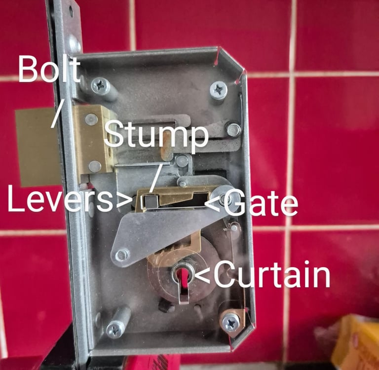 So how do they work ? in basic terms if you insert the correct key into the lock this simultaneously lifts the levers to the correct height and turns the curtain which opens a gate allowing the bolt stump to pass through and retract the bolt thus opening the lock.